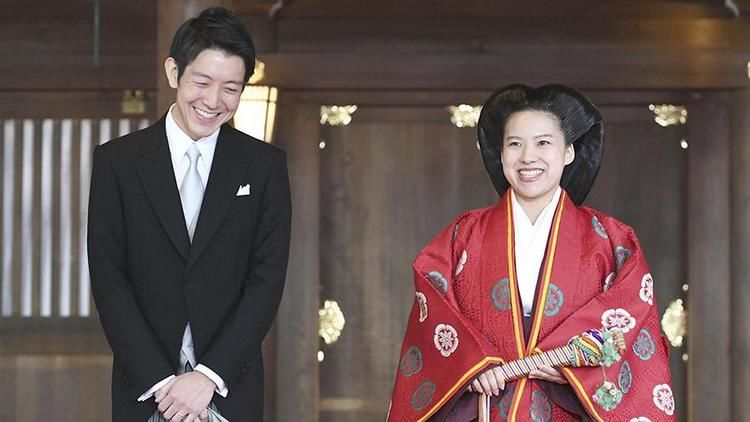 «У принцессы была прическа эпохи Хэйан (период в истории Японии с 794 по 1185 годы) и традиционное кимоно с красными и зелеными узорами. Жених одет во фрак. Пара закрепила союз благословленным рисовым вином и обменялась кольцами», — написали издания.
