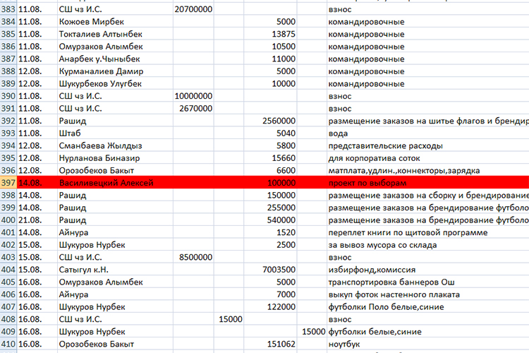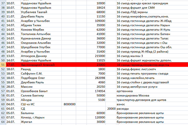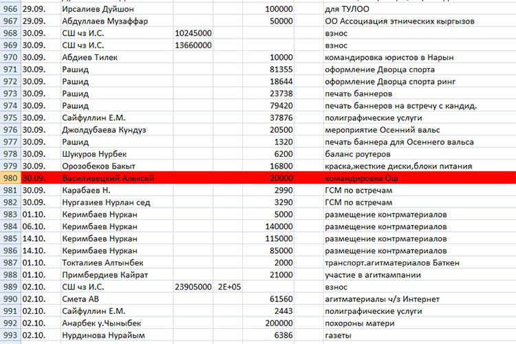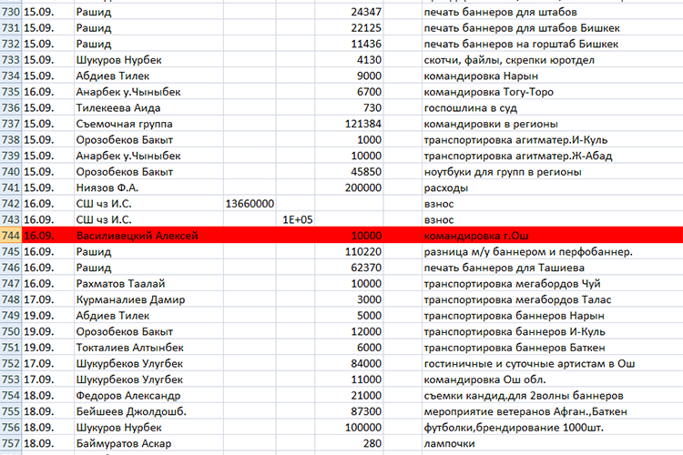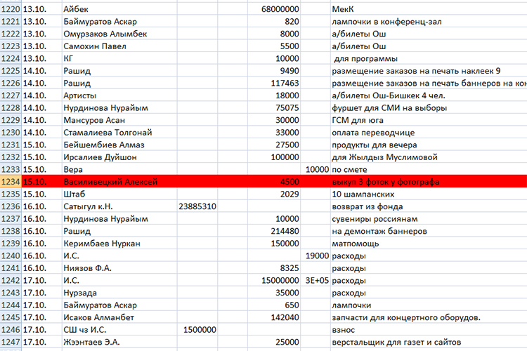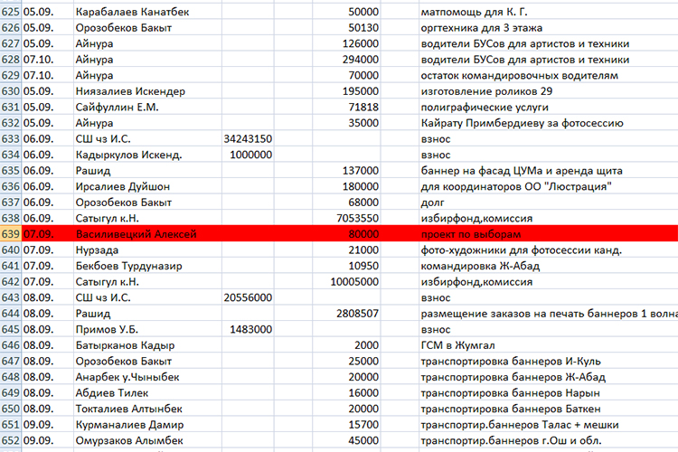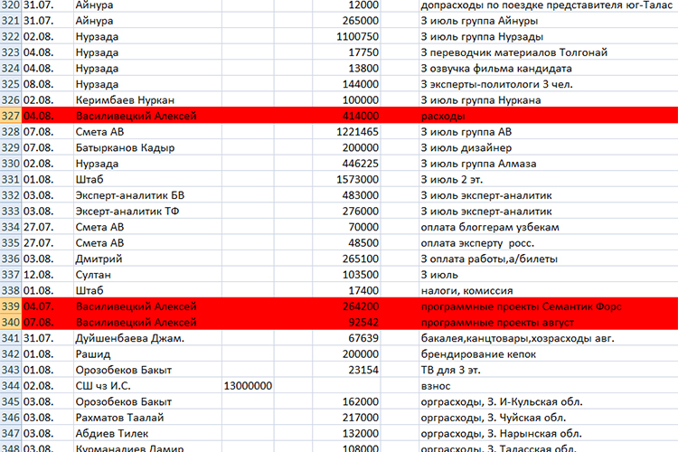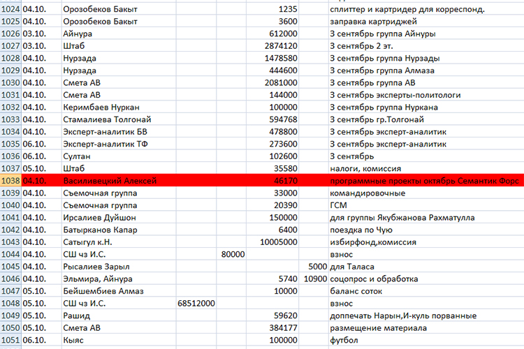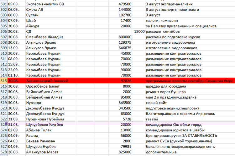Тем более ни о каких 500 тысячах речи быть не может. По тому, что опубликовано было у Токтакунова, на фамилию Василивецкий там было записано порядка 1,3 миллиона сомов. Вот это реальная цифра. Однако там еще идет пометка «Семантик форс» — это компьютерная программа по мониторингу интернета, которой штаб пользовался, а оплачивалась она через меня. На что из указанной суммы ушло примерно $6 тысяч.