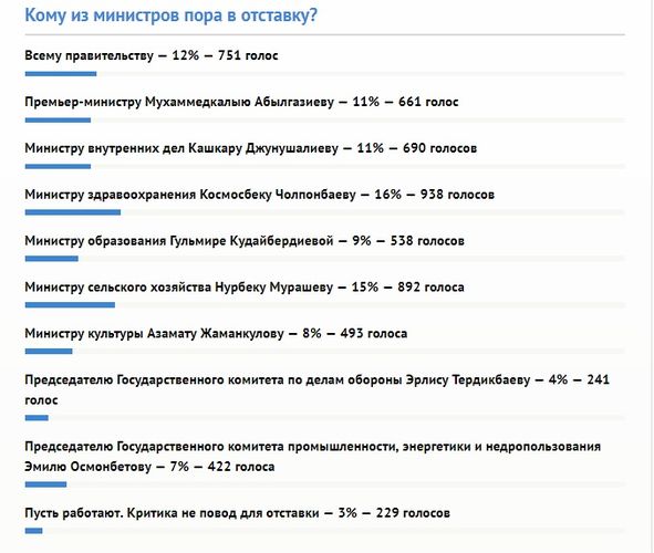24-kg.com выбрало только тех министров, в отношении которых критики больше всего, а за их ведомствами тянется шлейф скандалов, и провело опрос. Его итоги неутешительны для министра здравоохранения Космосбека Чолпонбаева. Большинство опрошенных (16 процентов) выступают за его отставку. На втором месте в перечне кандидатов на вылет министр сельского хозяйства Нурбек Мурашев. Его не хотят видеть во главе Минсельхоза 15 процентов проголосовавших.