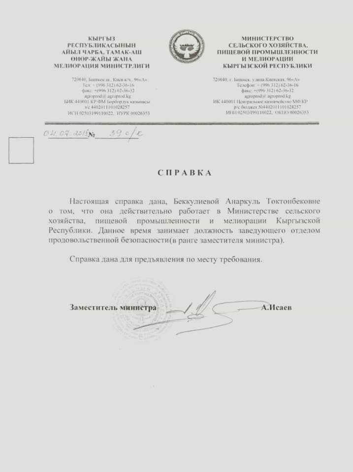 В Facebook опубликовали справку, подписанную заместителем министра сельского хозяйства Амангелди Исаевым. В документе говорится, что «Беккулиева Анаркуль Токтонбековна действительно работает в Министерстве сельского хозяйства, пищевой промышленности и мелиорации КР. Она занимает должность заведующей отделом продовольственной безопасности (в ранге заместителя министра)».