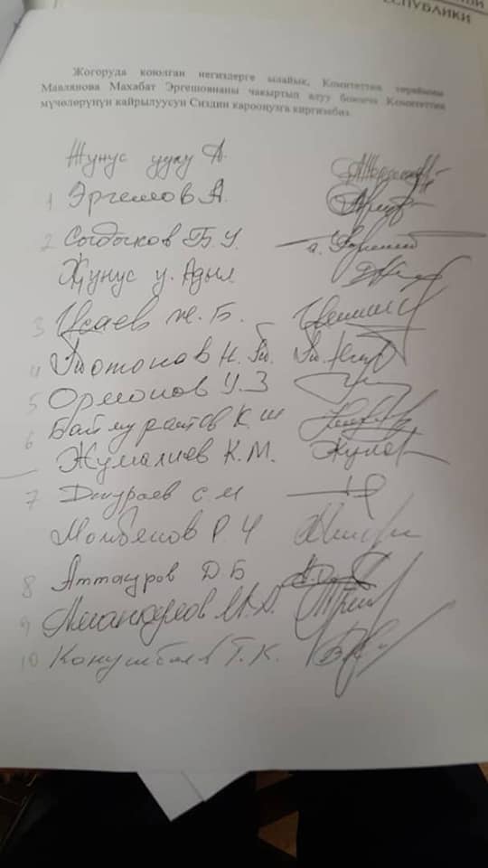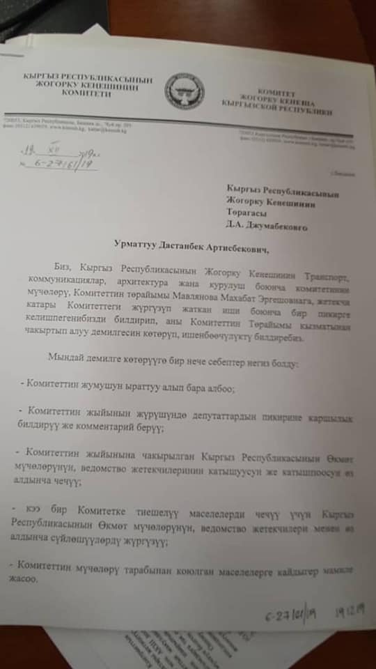 Спикеру парламента Дастанбеку Джумабекову десять депутатов пожаловались на свою коллегу Махабат Мавлянову. Письмо с их подписями поступило в аппарат торага.
