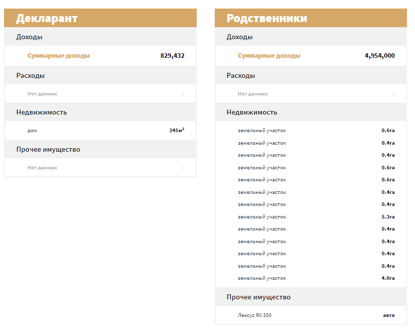 С близким родственником депутата — чаще всего это супруга — дело обстоит иначе. В 2016 году этот человек заработал почти 5 миллионов сомов, имел в собственности 13 земельных участков разной площади и машину «Лексус RX 330».