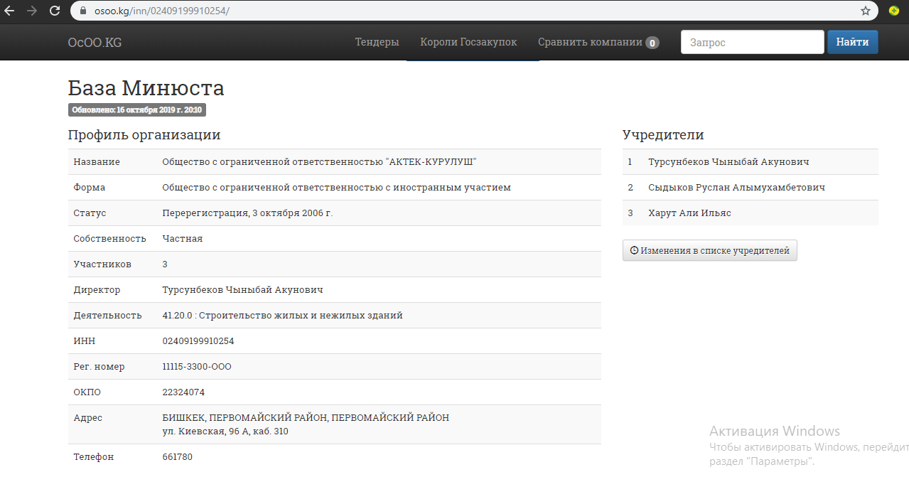 Сообщается, что «Актек-Курулуш» зарегистрировали как юридическое лицо в 1999 году. До недавнего времени у нее было три соучредителя — Чыныбай Турсунбеков, Сыдыков Руслан Алымухамбетович и Харут Али Ильяс. Поиск в Сети по данным лицам не дает результатов.