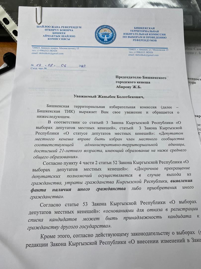 Бишкекская ТИК начала проверку на наличие двойного гражданства у депутата БГК Анатолия Горбунова. Об этом 24-kg.com сообщил председатель городской территориальной избирательной комиссии Кайрат Маматов.