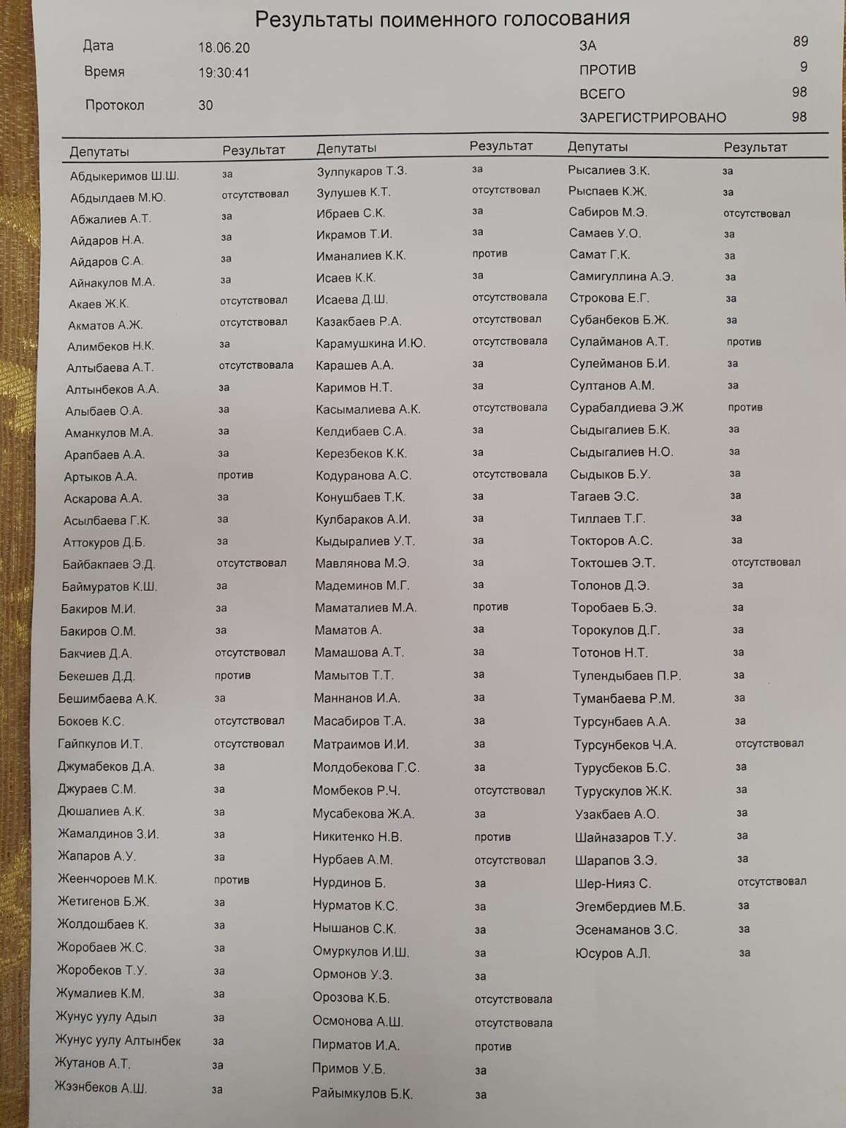 За проголосовали 89 депутатов, против — 9, всего зарегистрировано 98 депутатов.