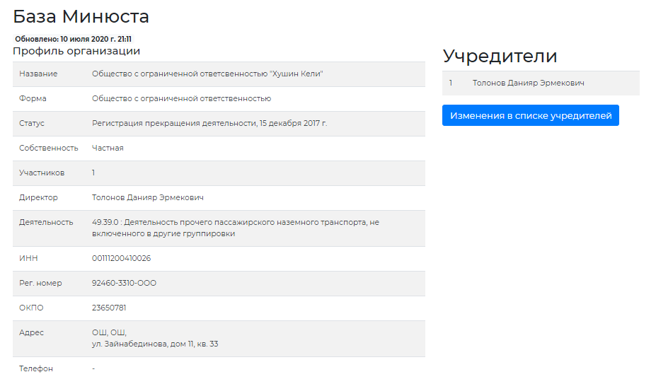 Фирма располагалась в Оше и занималась деятельностью прочего наземного пассажирского транспорта вплоть до конца 2017-го. Все то время, в которое Данияр Толонов, в частности, занимал различные должности в структуре Минсоцтруда и уже когда стал парламентарием. Он также был единственным владельцем компании.