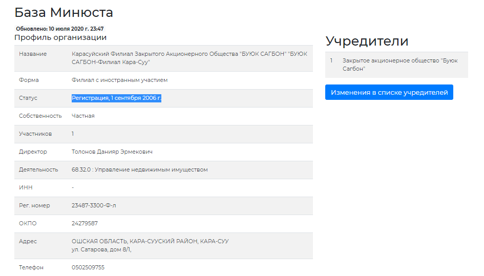 Второй бизнес — это ЗАО «БУЮК САГБОН — Филиал Кара-Суу», в котором депутат по сей день числится директором. Это фирма с иностранным участием, как указано в учредительных документах и занимается управлением недвижимым имуществом с сентября 2006-го.
