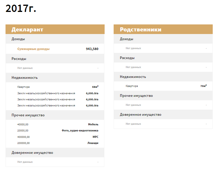 В числе крупного имущества депутат перечислил квартиру площадью 68 квадратных метров, три участка по 6 гектаров и лошадей на 200 тысяч сомов. У близкого родственника нет заработка и какого-либо имущества, кроме квартиры в 76 квадратных метров.
