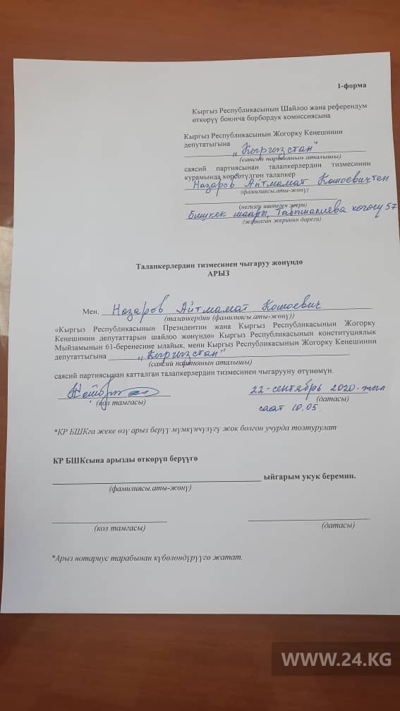 Айтмамат Назаров вышел из списка партии «Кыргызстан», где он занимал 58-е место. Об этом сообщает Центризбирком.
