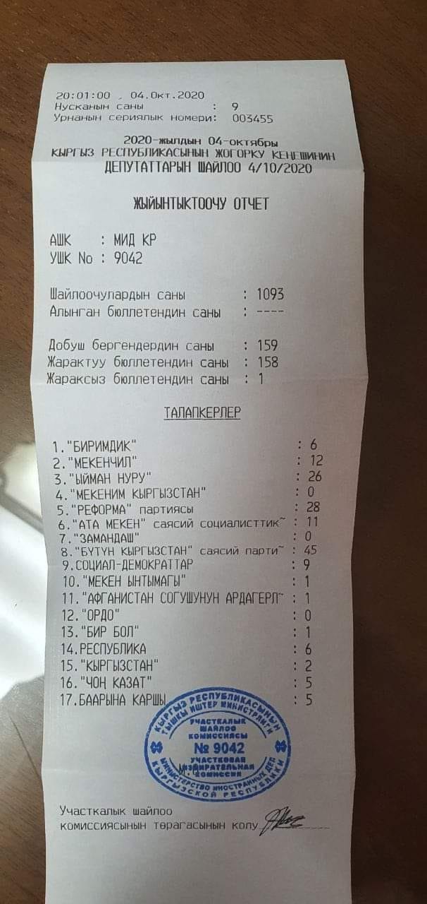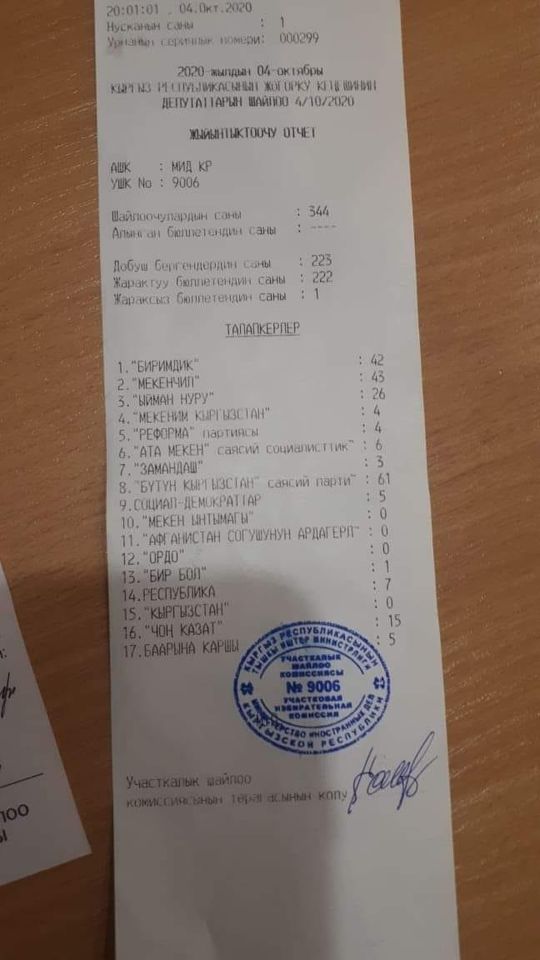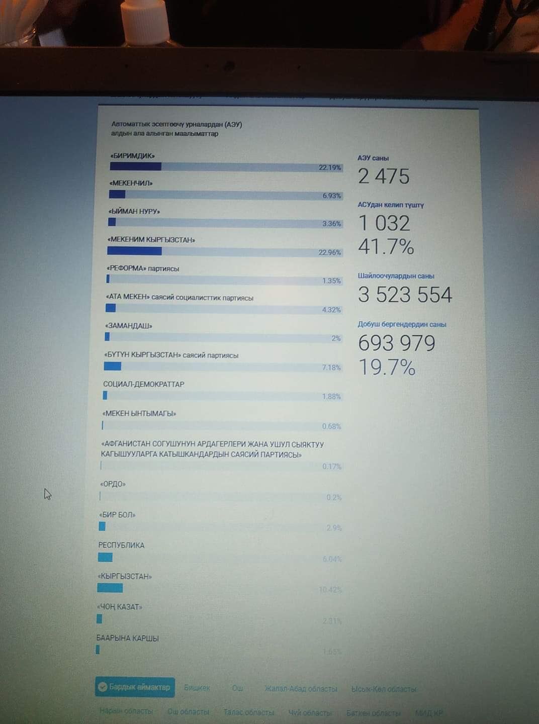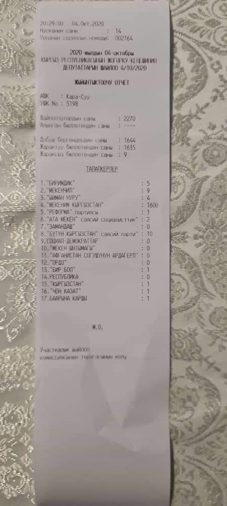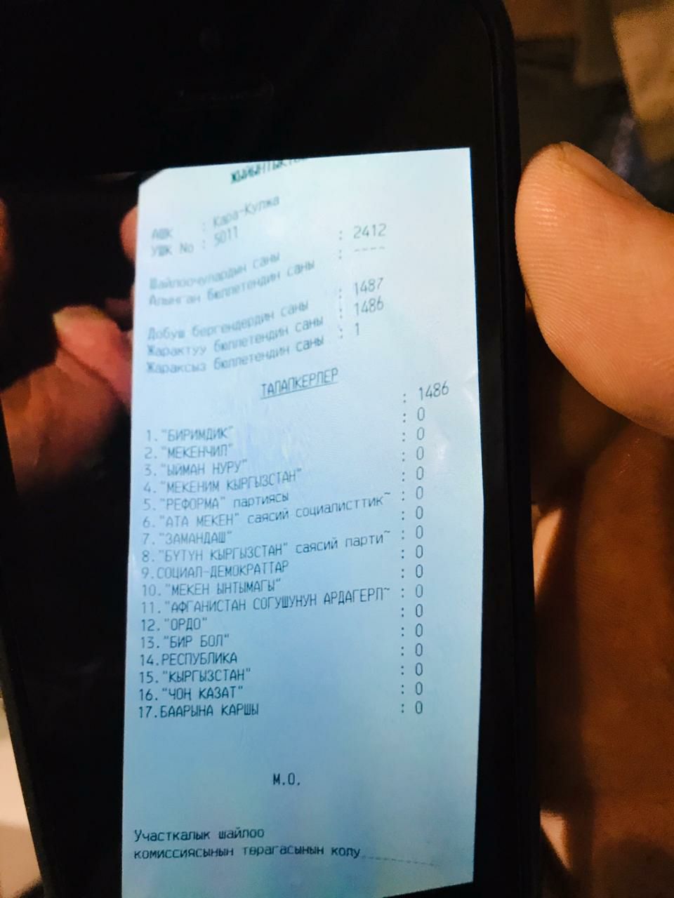 В соцсетях опубликовали фотографии отчетов автоматически считывающих урн (АСУ) с избирательных участков в Кара-Суу (УИК № 5198) и Кара-Кульдже (УИК № 5011), где избиратели почти единогласно проголосовали за две партии «Биримдик» и «Мекеним Кыргызстан».
