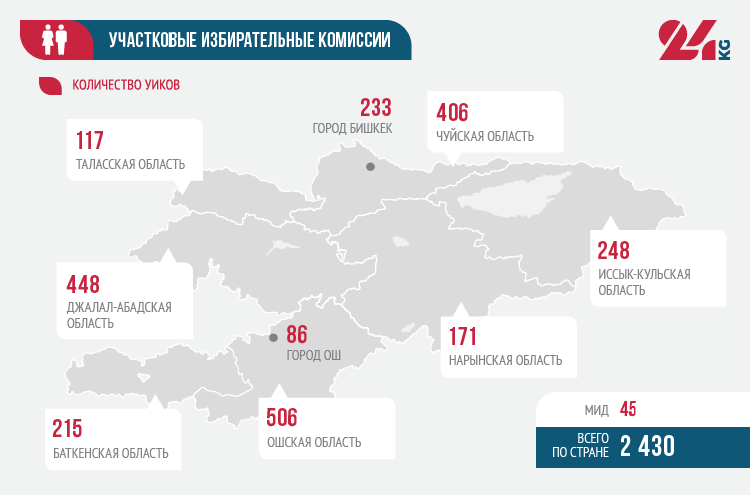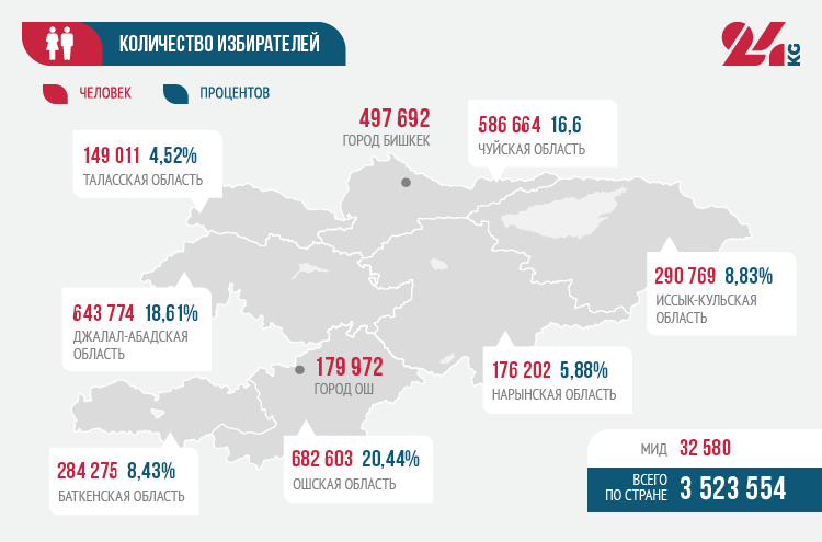 Всего, по данным Центральной комиссии по выборам и проведению референдумов, в списки избирателей внесены 3 миллиона 523 тысячи 532 человека. Наибольшее число избирателей – в Ошской области, 20,44 процента.