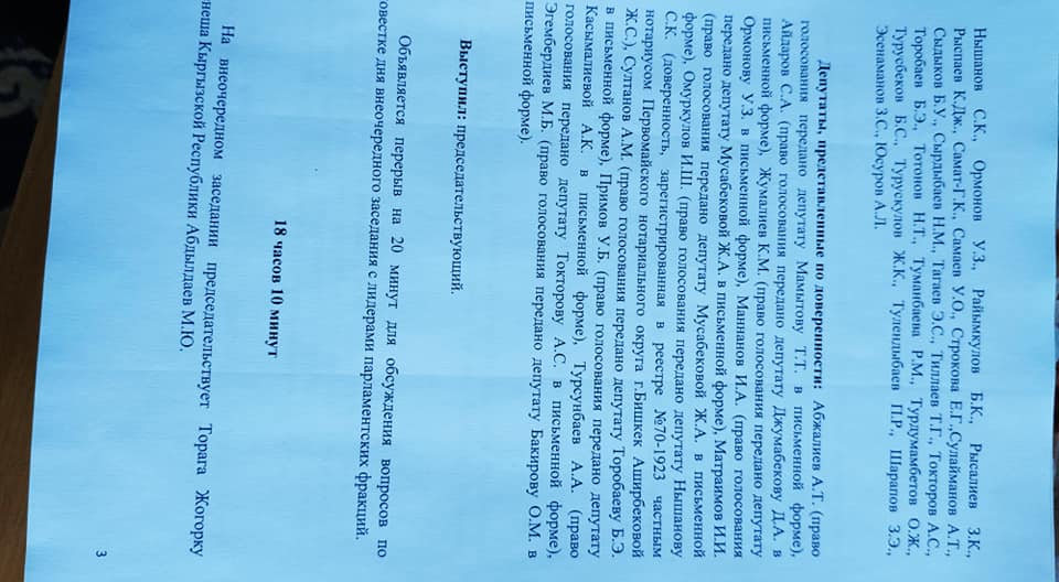 Пресс-служба Жогорку Кенеша опубликовала список депутатов, присутствовавших на заседании 10 октября в государственной резиденции «Ала-Арча».