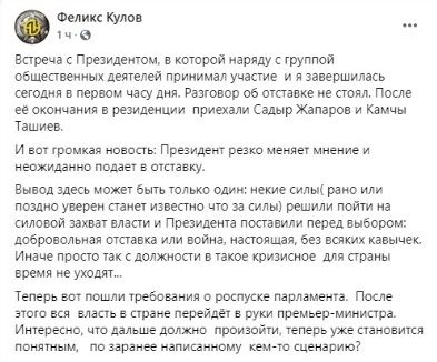 Экс-премьер-министр Феликс Кулов уверен, что президента поставили перед выбором: добровольная отставка или война. Об этом он написал на своей странице в Facebook.