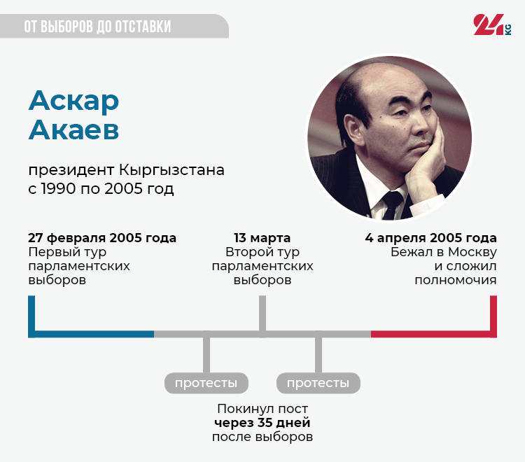В феврале—марте 2005 года в Кыргызстане прошли выборы депутатов третьего созыва Жогорку Кенеша. По их итогам, по данным ЦИК, абсолютное большинство мандатов получили сторонники Аскара Акаева. На юге страны начались протесты с требованием пересмотра итогов выборов и отставки президента. 23 марта они докатились до столицы. На следующий день митингующие захватили правительство, парламент, в центре города начались массовые погромы. Президент бежал и лишь 4 апреля в посольстве в Москве официально подписал заявление об отставке.