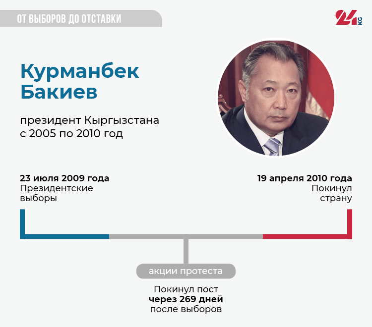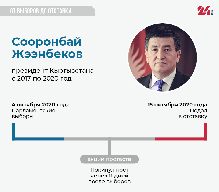 4 октября 2020 года в Кыргызстане прошли выборы депутатов парламента. На следующий день в стране начались митинги, участники которых требовали отменить итоги голосования. С таким же требованием выступили лидеры 12 политических партий, участвовавших в выборах, но не сумевшие преодолеть семипроцентный барьер. Акция протеста переросла в столкновения с силами правопорядка. В результате один человек погиб, 1 тысяча 221 получил ранения. Премьер-министр подал в отставку. А 15 октября о решении сложить с себя полномочия заявил и президент Сооронбай Жээнбеков. Со дня выборов прошло 11 дней.