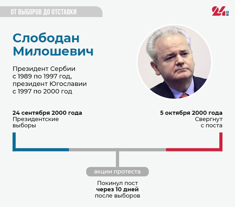 24 сентября 2000 года в Югославии прошли президентские выборы. Действующий глава государства Слободан Милошевич отказался признать победу Воислава Коштуницы, лидера демократической оппозиции. 5 октября Конституционный суд аннулировал результаты выборов. Ответом стал митинг в Белграде, собравший около 500 тысяч человек. На нем оппозиция провозгласила президентом Коштуницу. Митинг перерос в бунт, толпа захватила здание союзного парламента и телецентр. На следующий день Милошевич подал в отставку. Конституционный суд, отменив свое предыдущее решение, объявил Коштуницу победителем выборов.