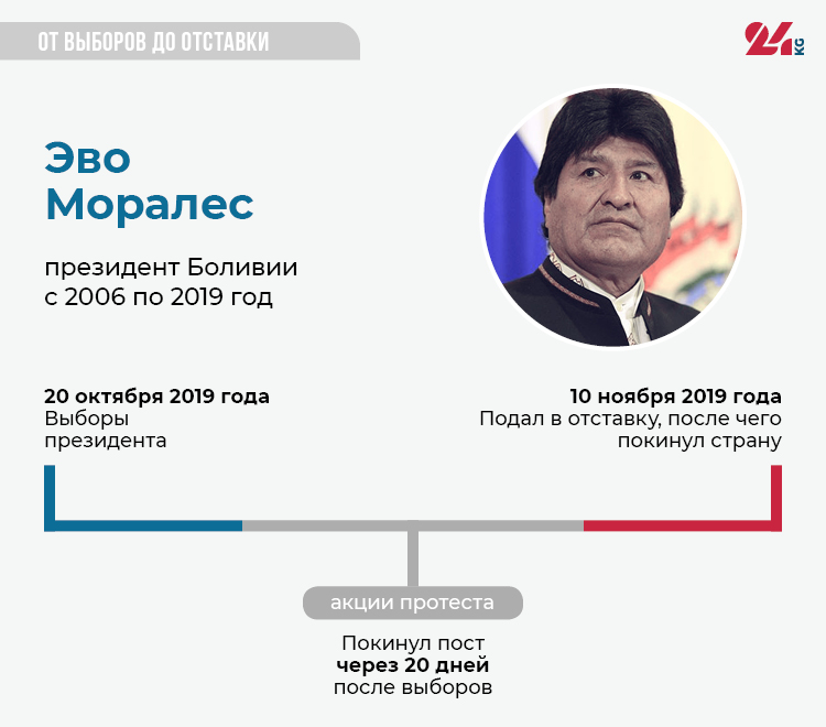 Выборы президента в Боливии состоялись 20 октября 2019 года. По их итогам действующий глава государства Эво Моралес получил 46,86 процента голосов — на 12 процентов больше, чем его соперник Карлос Меса. Моралес сразу объявил себя победителем, что привело к протестам и беспорядкам в стране. Пересчет голосов проводила Организация американских государств (ОАГ). Она выявила «явные манипуляции» с системой голосования. 10 ноября президент признал нарушения на выборах и на фоне продолжающихся протестов объявил о своей отставке.