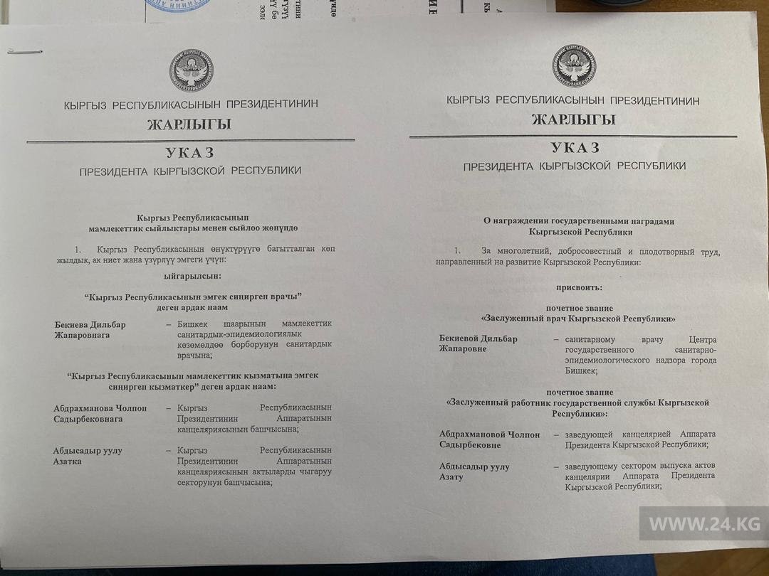 Такой же награды удостоены заведующая канцелярией Чолпон Абдрахманова, заведующий сектором актов канцелярии Азат Абдысадыр уулу и завотделом политики госуправления и организационно-инспекторской работы Акылбек Орозалиев.