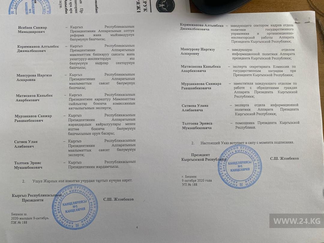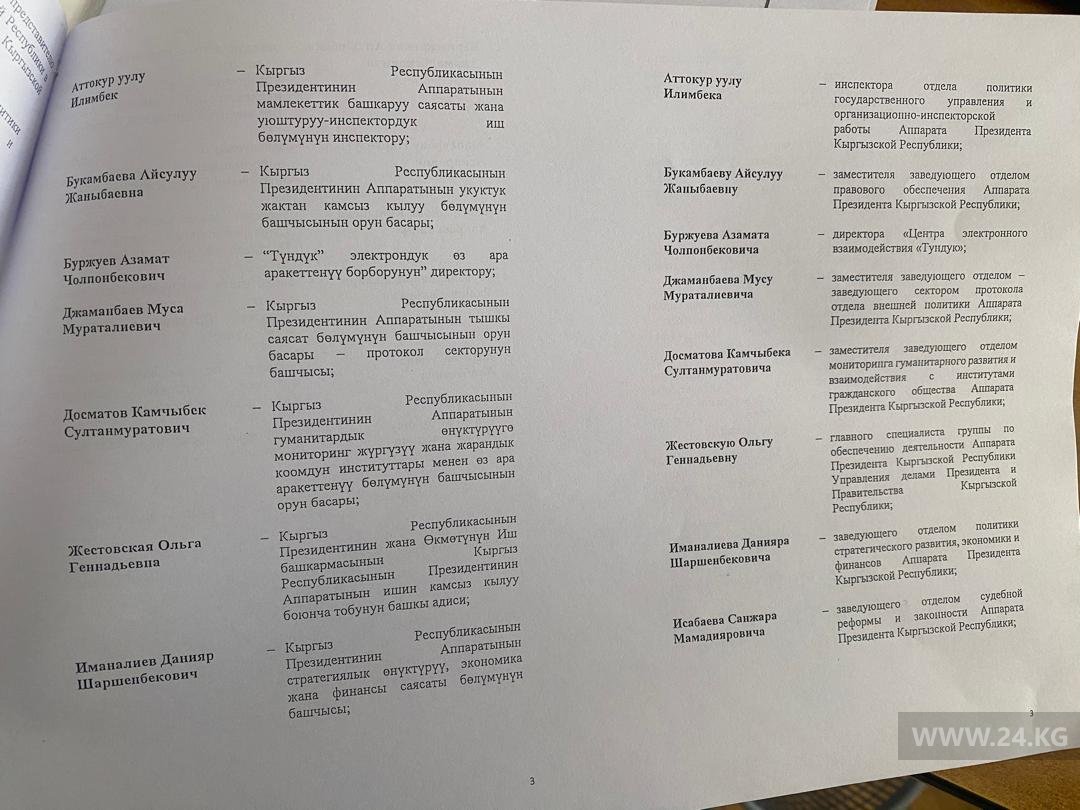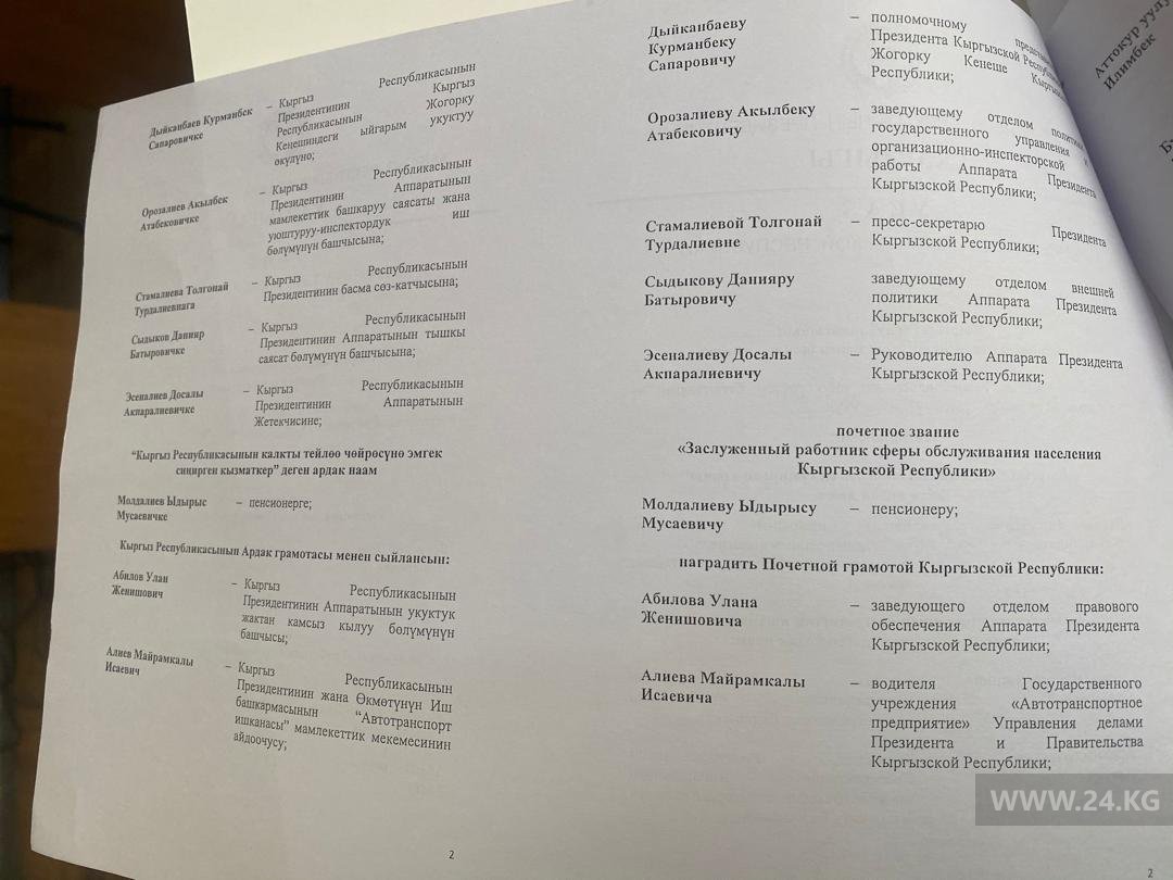 Еще 16 чиновников получили почетные грамоты, в том числе помощник президента Эрнис Толтоев и водитель Майрамкалы Алиев.