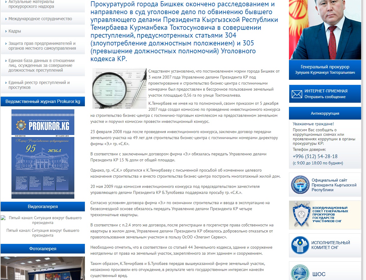 По его данным, Балбак Тулобаев, будучи заместителем управляющего делами президента, по предварительному сговору со своим руководителем Курманбеком Темирбаевым, незаконно получив земельный участок по улице Токтоналиева в Бишкеке, передал его под строительство многоэтажного дома частной компании. Условием сделки было получение на баланс управделами пяти квартир.После окончания строительства их передали различным ненадлежащим лицам.