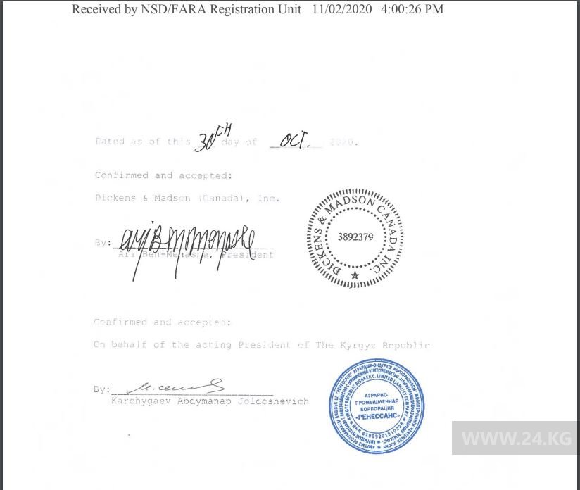 Договор подписали представитель компании Dickens & Madson Canada Ари Бен-Менаше, а от имени и. о. президента Кыргызстана Абдыманап Карчыгаев. На документе стоит печать аграрно-промышленной корпорации «Ренессанс».