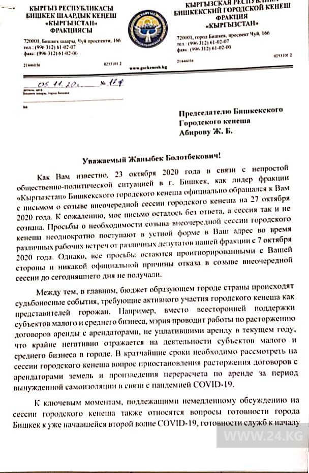 «Я повторно написал на имя спикера письмо о созыве сессии. В главном бюджетообразующем городе страны происходят судьбоносные решения, которые мы должны обсудить. Вместо поддержки субьектам малого и среднего бизнеса мэрия Бишкека проводит работу по расторжению договоров с арендаторами, имеющими задолженность, считают пеню. В то же время контролирующие органы постоянно давят на них. С одной стороны, им разрешено работать, с другой, вроде нет. Кадровая чехарда в самом муниципалитете, какие-то случайные люди приходят, садятся на должности. Это предлагаю обсудить», — отметил он.