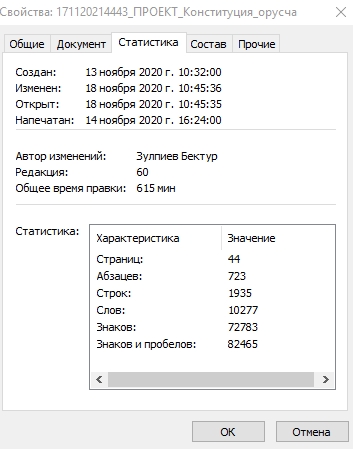 В свойствах документа автором проекта новой редакции Основного закона указан заместитель руководителя аппарата главы государства Бектур Зулпиев. Документ создан 13 ноября.