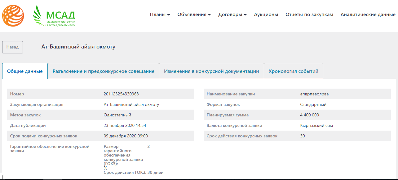 Ат-Башинский айыл окмоту хочет купить «апврпваолрва» за 4,4 миллиона сомов. Такое название указано в объявлении на портале государственных закупок.