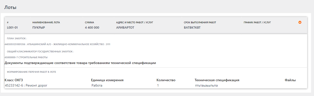 В развернутой информации о лоте указано только, что речь идет о ремонте дороги, но при этом в поле о технических спецификациях снова непонятное «птьтаьаььпьпа».