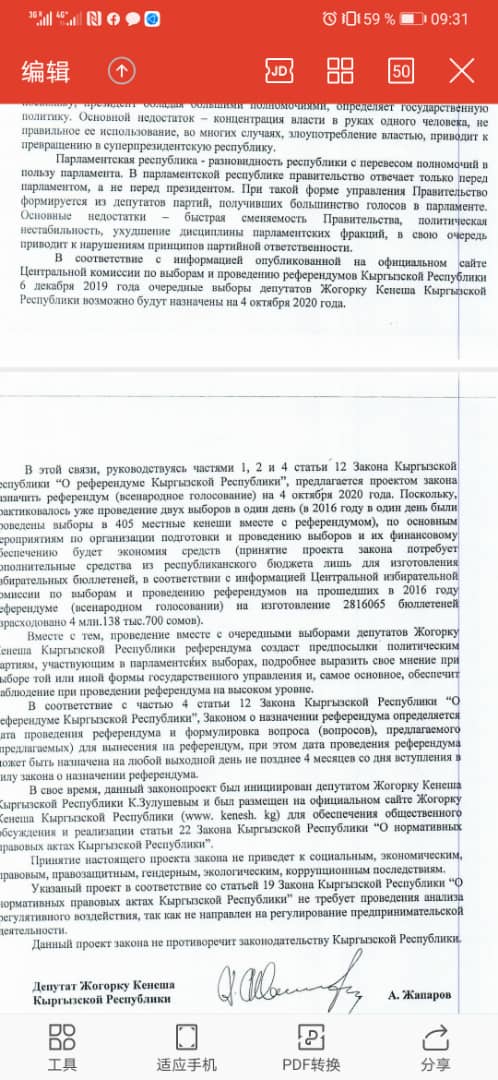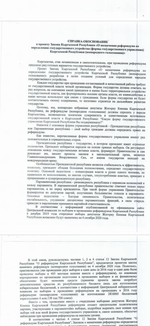 В прилагаемой справке-обосновании говорится, что эта инициатива аналогична той, которую выдвигал экс-депутат Курманкул Зулушев в апреле этого года.