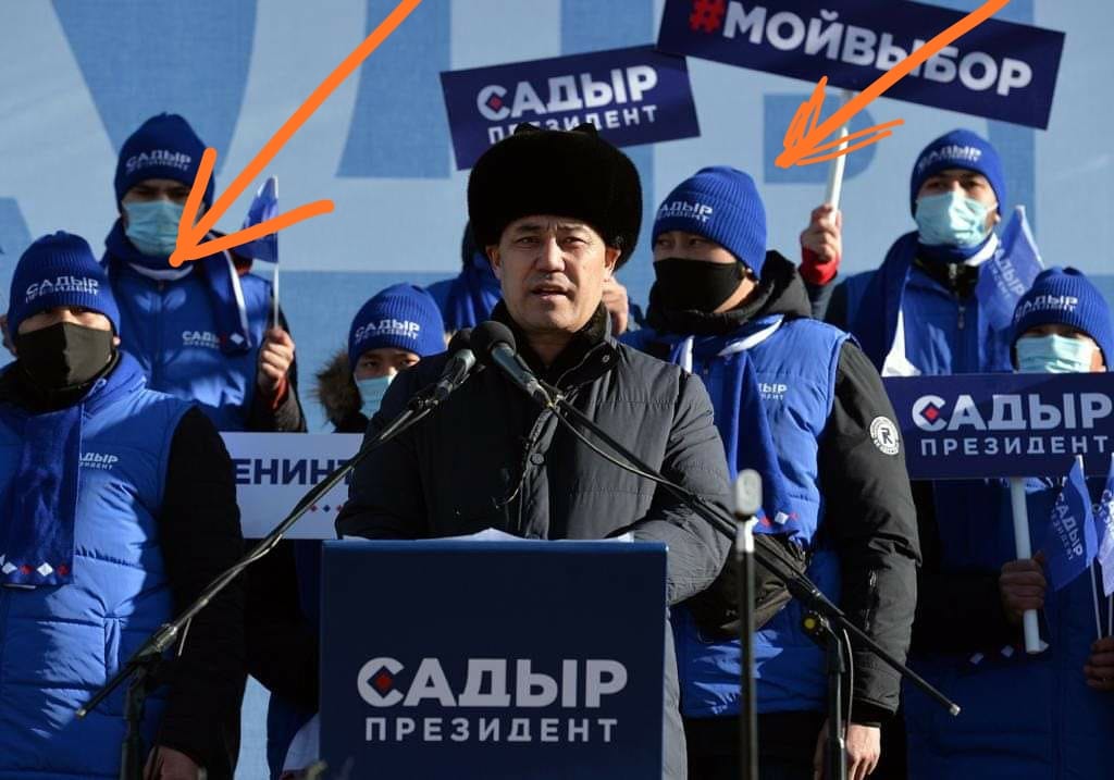 На фото и видео четко видно, что телохранители, стоящие рядом с Садыром Жапаровым, одеты в жилетки и шапки с агитационным логотипом. То есть они грубо нарушают закон.