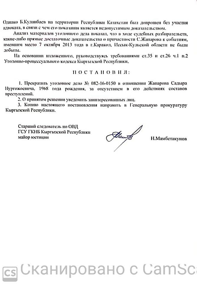 В документе указывается, что уголовное дело прекращено за отсутствием в действиях Садыра Жапарова состава преступления.