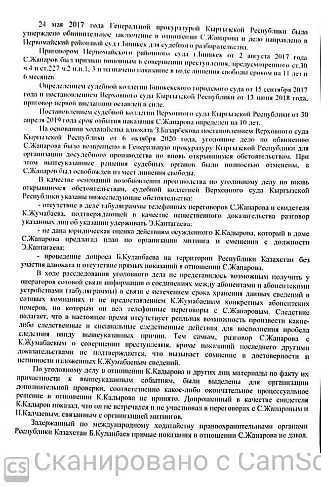 В тот же день Верховный суд рассмотрел и удовлетворил ходатайство адвоката Садыра Жапарова Шарабедина Токтосунова о пересмотре уголовного дела по вновь открывшимся обстоятельствам.