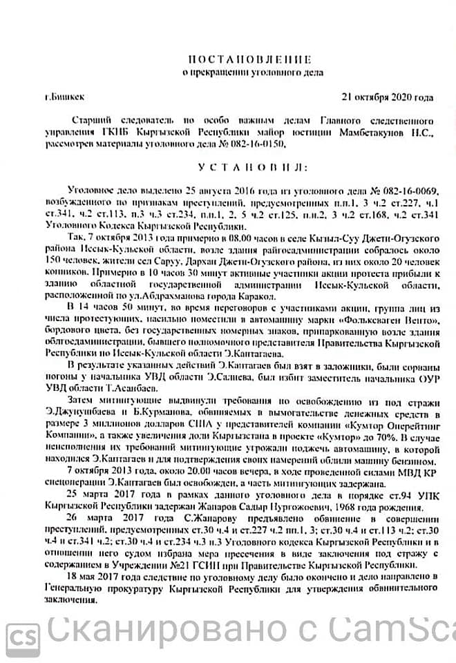 Постановление подписано старшим следователем главного следственного управления ГКНБ Н.Мамбетакуновым 21 октября 2020 года.