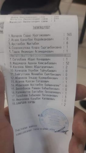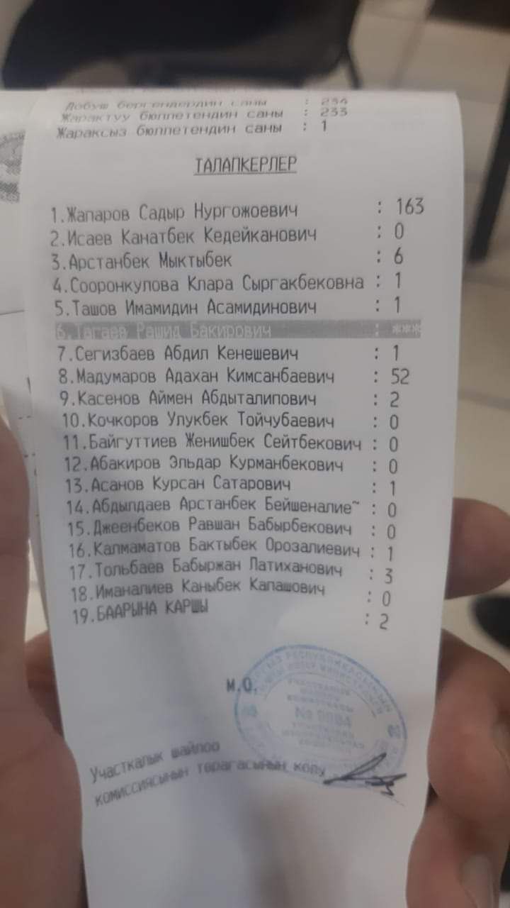 По предварительным данным, проголосовали 234 избирателя. Большинство из них — 163 человека — отдали голоса за Садыра Жапарова. На втором месте Адахан Мадумаров. За него проголосовали 52 человека.