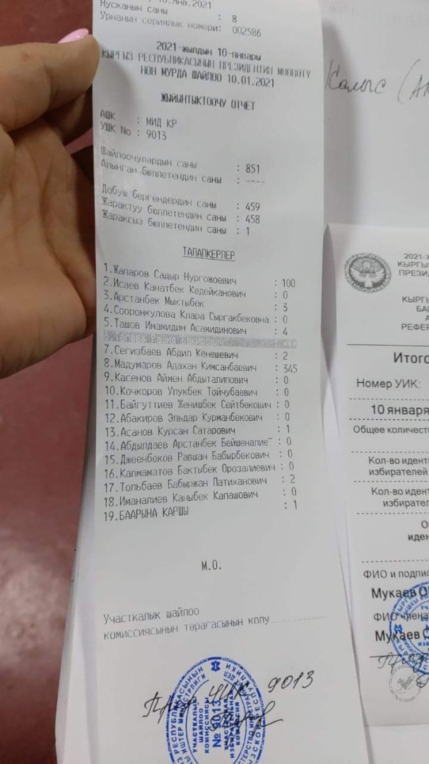Однако в редакцию прислали другой чек, согласно которому большинство голосов в Южно-Сахалинске отдано за кандидата в президенты Адахана Мадумарова — 345. За Садыра Жапарова проголосовало 100 человек. Этот чек также заверен печатью. Роспись ответственного идентична росписи на ранее опубликованном чеке.
