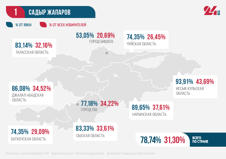 По официальным данным, меньше всего Садыр Жапаров набрал голосов в Бишкеке. Если бы на участки пришли все избиратели, зарегистрированные в столице, то у него было бы чуть больше одной пятой голосов.Адахан Мадумаров