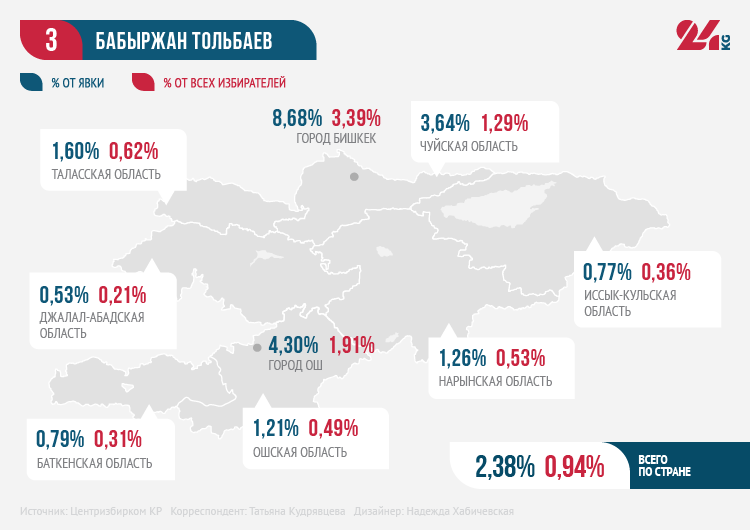 Интересно, что Бабыржан Тольбаев хоть и оказался на третьей строчке по итогам голосования по республике, в регионах не особо известен избирателям. По итогам голосования в Иссык-Кульской области он уступил третью строчку экс-судье Конституционной палаты Кларе Сооронкуловой, в Оше — Мыктыбеку Арстанбеку. А в Баткенской области и вовсе оказался только шестым.