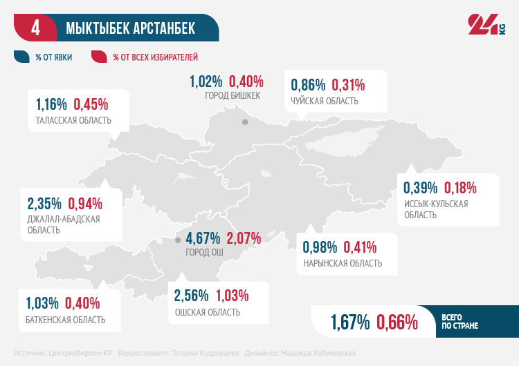 В Бишкеке Мыктыбек Арстанбек оказался крайне непопулярен. Он не вошел даже в первую десятку по итогам голосования. Зато в Оше и Джалал-Абадской области он оказался на третьей строчке, сразу после Садыра Жапарова и Адахана Мадумарова.