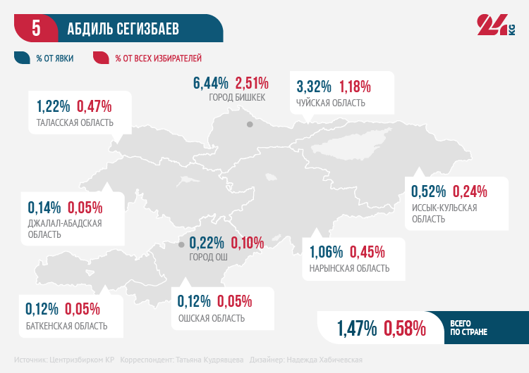 Экс-глава ГКНБ Абдиль Сегизбаев наилучшие результаты показал в Бишкеке, Чуйской и Нарынской областях. Но в большинстве регионов ему не удалось набрать и 1 процента голосов.