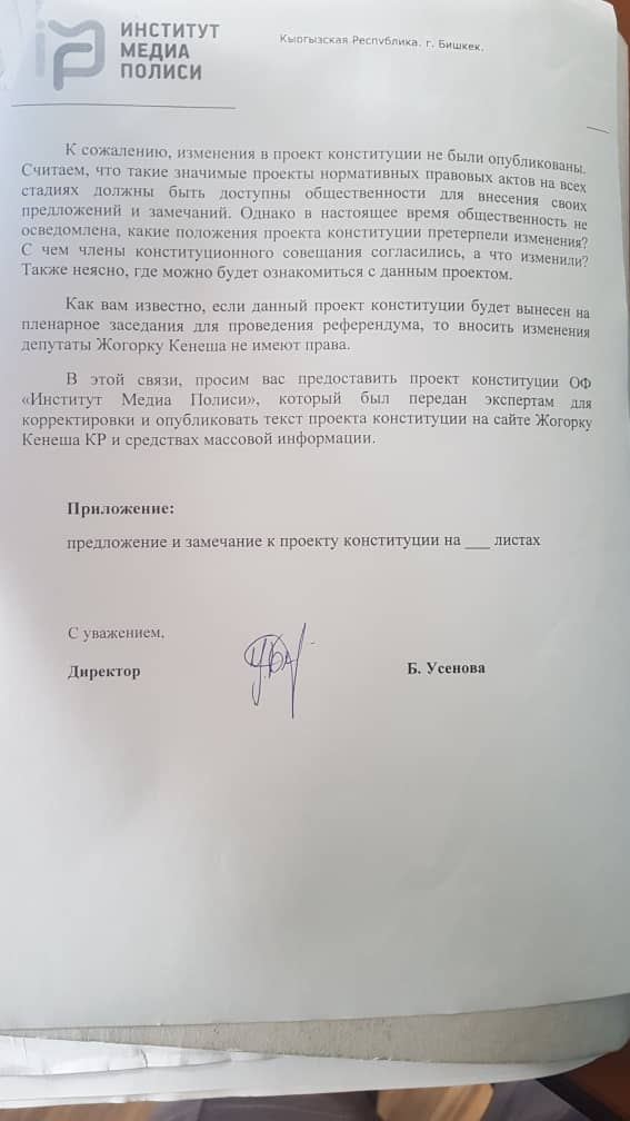 Юристы попросили предоставить проект Конституции для ОФ «Институт Медиа Полиси» и опубликовать его текст на сайте Жогорку Кенеша и в СМИ.