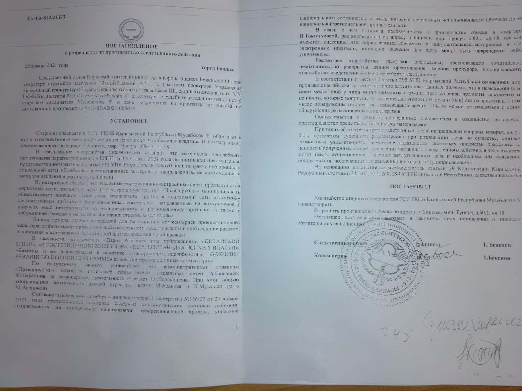 «Согласно заключению судебно-лингвистической экспертизы, материалы содержат признаки действий, направленных на возбуждение национальной, межрегиональной вражды, унижение национального достоинства, а также признаки пропаганды неполноценности граждан по межнациональной, региональной принадлежности. В связи с этим возникла необходимость в производстве обыска в квартире Нурзады Токтогуловой, так как имелись опасения, что некоторые материалы, в том числе электронные носители, имеющие значение для дела, могут быть повреждены либо уничтожены», — говорится в постановлении суда.