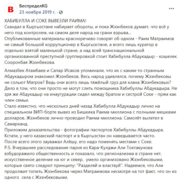 Стало известно, что блогеров вызывали из-за группы в соцсети под названием «Правдоруб.кг». В постановлении суда отмечается, что там систематически публикуют провокационные материалы, направленные на возбуждение, нетерпимость по национальному и региональному признакам, побуждают граждан к незаконным и насильственным действиям.