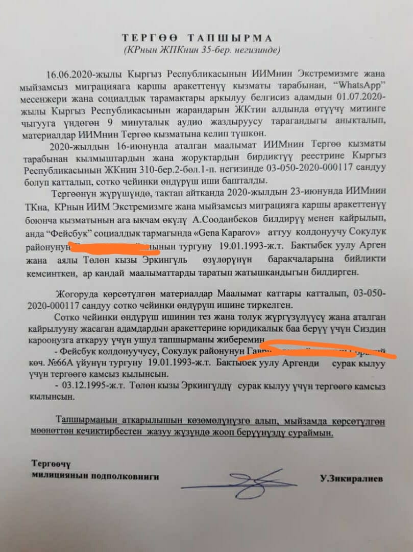 Или вызов на допросы за невинные мемы и карикатуры дизайнера Никиты Тарасенко и администратора сатирической группы «Меместан» в Facebook. На допросы таскали журналиста Аргена Бактыбек уулу и его супругу Эркину Асанбаеву.