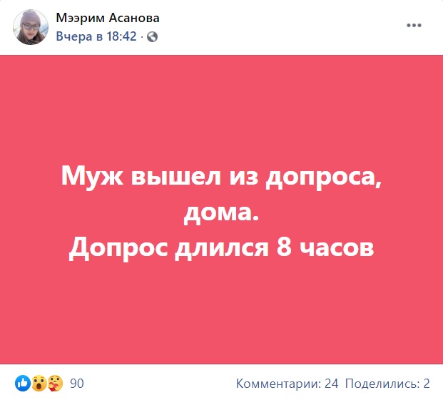 На допросе побывала еще одна его сторонница — Мээрим Асанова. В ее доме также провели обыск, забрали сотовые телефоны и ноутбуки. Ее супруга тоже вызвали на допрос в ГКНБ.