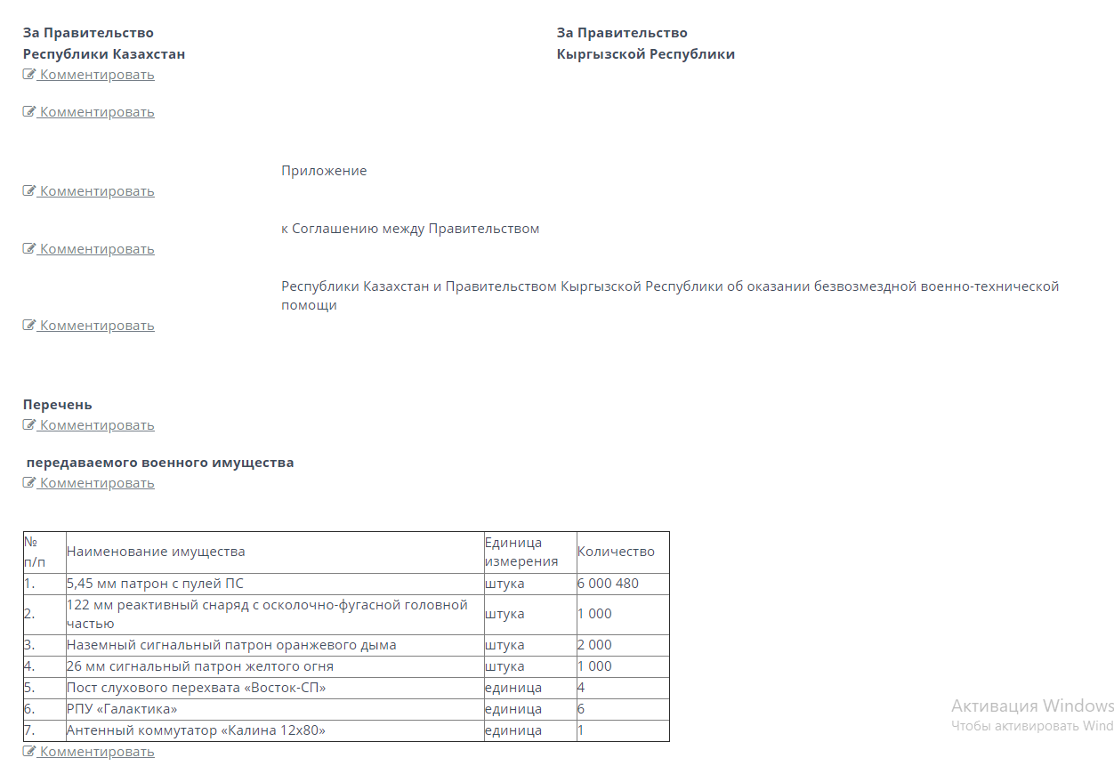Согласно документу Кыргызстан получит 6 миллионов 480 автоматных патронов (5,45 миллиметра), 1 тысячу реактивного снаряда с осколочно-фугасной головной частью (122 миллиметра), 2 тысячи наземного сигнального патрона оранжевого дыма, 1 тысячу сигнального патрона желтого огня (26 миллиметров), 4 поста слухового перехвата «Восток-СП», 6 РПУ «Галактика», один антенный коммутатор «Калина 12×80».