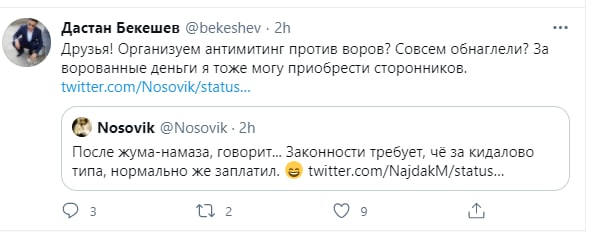 Депутат Жогорку Кенеша Дастан Бекешев предлагает организовать антимитинг против акции поддержки экс-замглавы Таможенной службы Райымбека Матраимова. Об этом он написал на своей странице в Twitter.