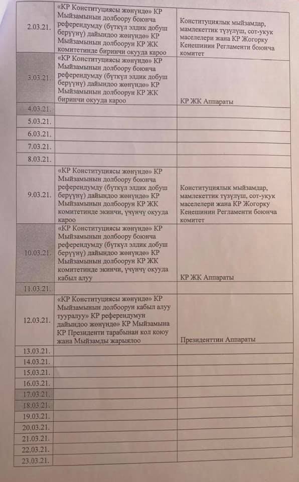 Ранее была опубликована дорожная карта по принятию проекта Основного закона, где указаны сроки и дата проведения обсуждения и заседания профильного комитета Жогорку Кенеша. В ней также предлагалось провести референдум 11 апреля.