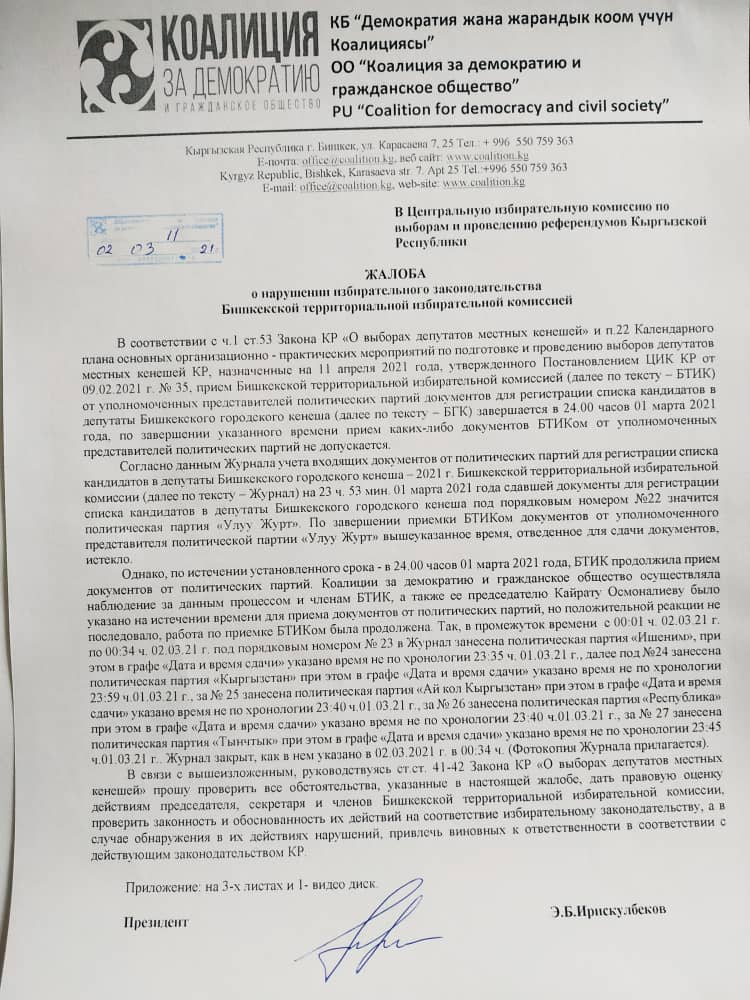 «Согласно данным журнала учета входящих документов от политических партий, для регистрации списка кандидатов в депутаты на 23.53 1 марта последней сдавшей документы партией была «Улуу Журт». После чего отведенное время истекло. Коалиция и гражданское общество, которые наблюдали за процессом, указали на это председателю и членам БТИК, но они продолжили прием документов», — отметили в коалиции.