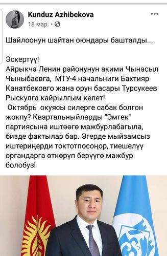 Активистка Кундуз Ажибекова написала на своей странице в Facebook , что один из кандидатов партии «Эмгек» Руслан Жакышев при помощи теперь уже экс-акима Ленинского района Чынасыла Чыныбаева использовал квартальных, чтобы прописать на участках по форме № 1 жителей новостроек, в частности «Арча-Бешика».